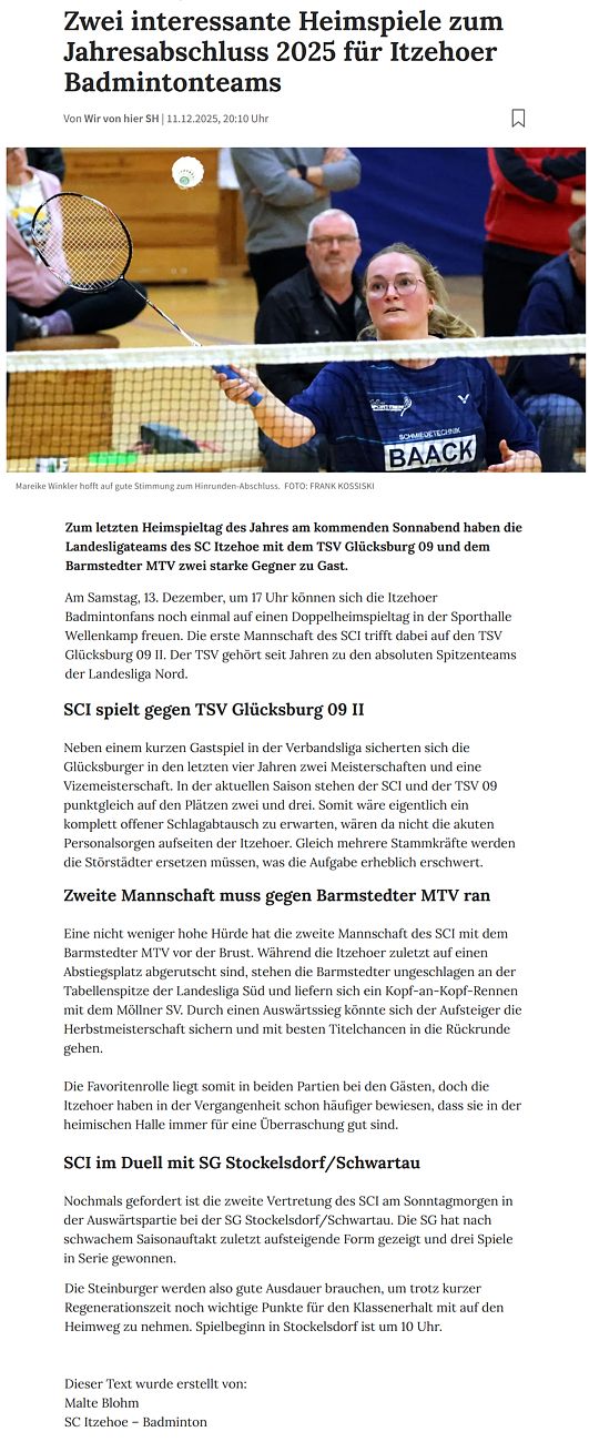 | Vorbericht im sh:z über das Heimspiel unserer zweiten Mannschaft am Samstag gegen das Landesligateam von BW Wittorf und das Auswärtsspiel unserer ersten Mannschaft am Sonntag bei der SG TSV Kronshagen / Kieler BC. |